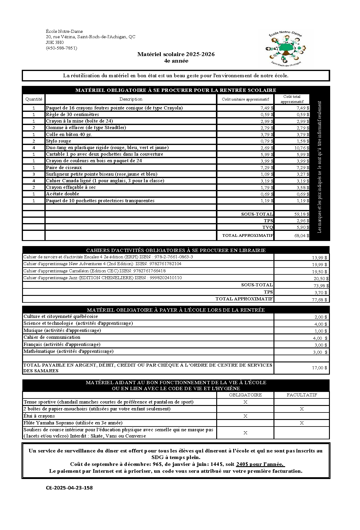 Dépot de 10$ pour la préparations de la liste (remboursé lors du ramassage)